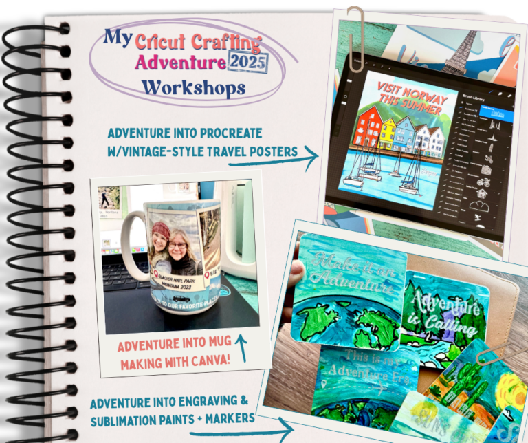 For Cricut Adventure 2025, I’ve got a fabulous 3 workshop splanned! I’ll show you how to retro style travel posters you’ll love to display in your home- or camper! You’ll also learn how to sublimate without a printer, engrave coasters with your Cricut, and design a souvenir mug in Canva!